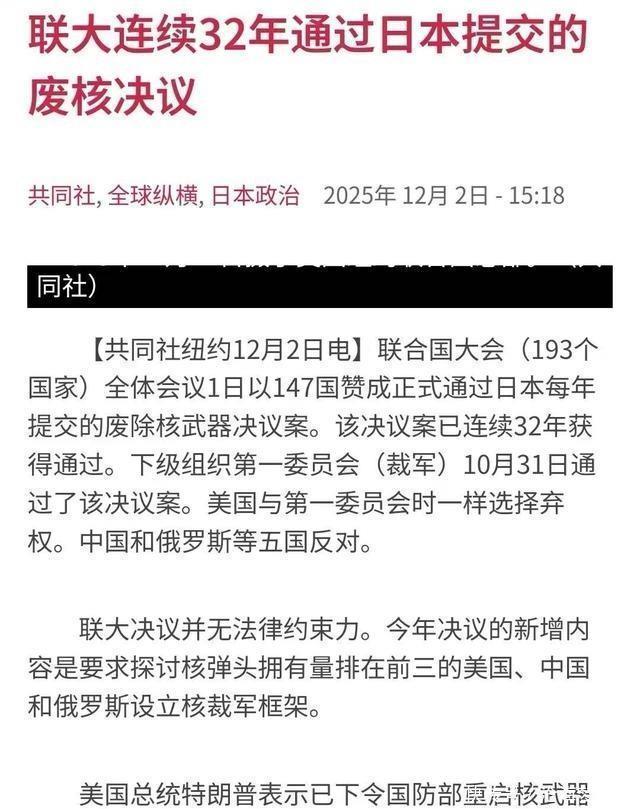 日本在联合国每年推废核议案,利用各国怕核的心态。可中国批驳,日本想加深广岛印象,偷换身份。 2025年这个决议强调桥梁作用,连接拥核和非拥核国,但没新意。高市推动下,通过了,可日本右翼庆祝,政府却忧心国际警惕加深。 日本计划向菲律宾出口导弹,磋商中。决议后,没督促到裁军,反暴露野心。高市政府孤立深,举措导致困境。总的来说,这个决议通过了,中俄反对没挡住,可高市高兴不起来,因为美国不买账,国内国际压力山大,日本的路越走越窄。