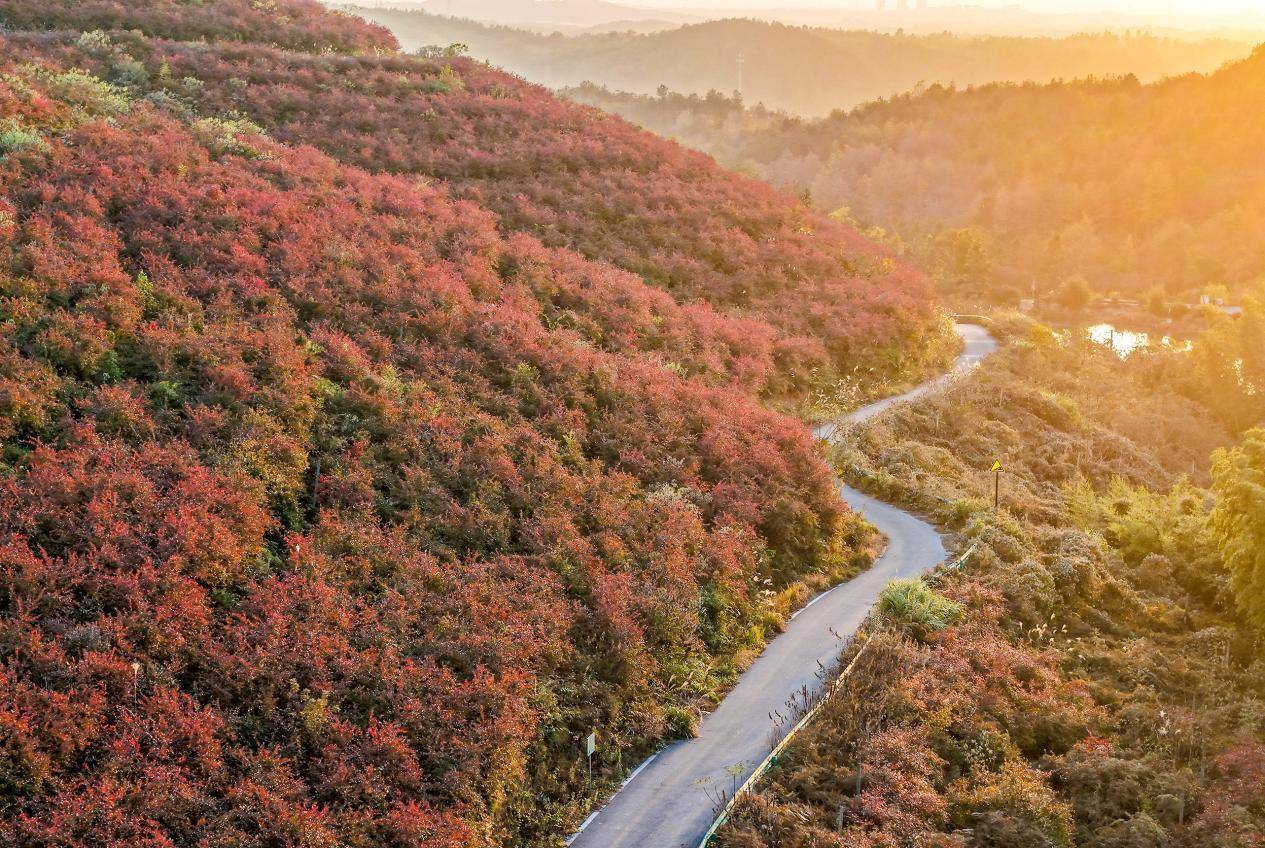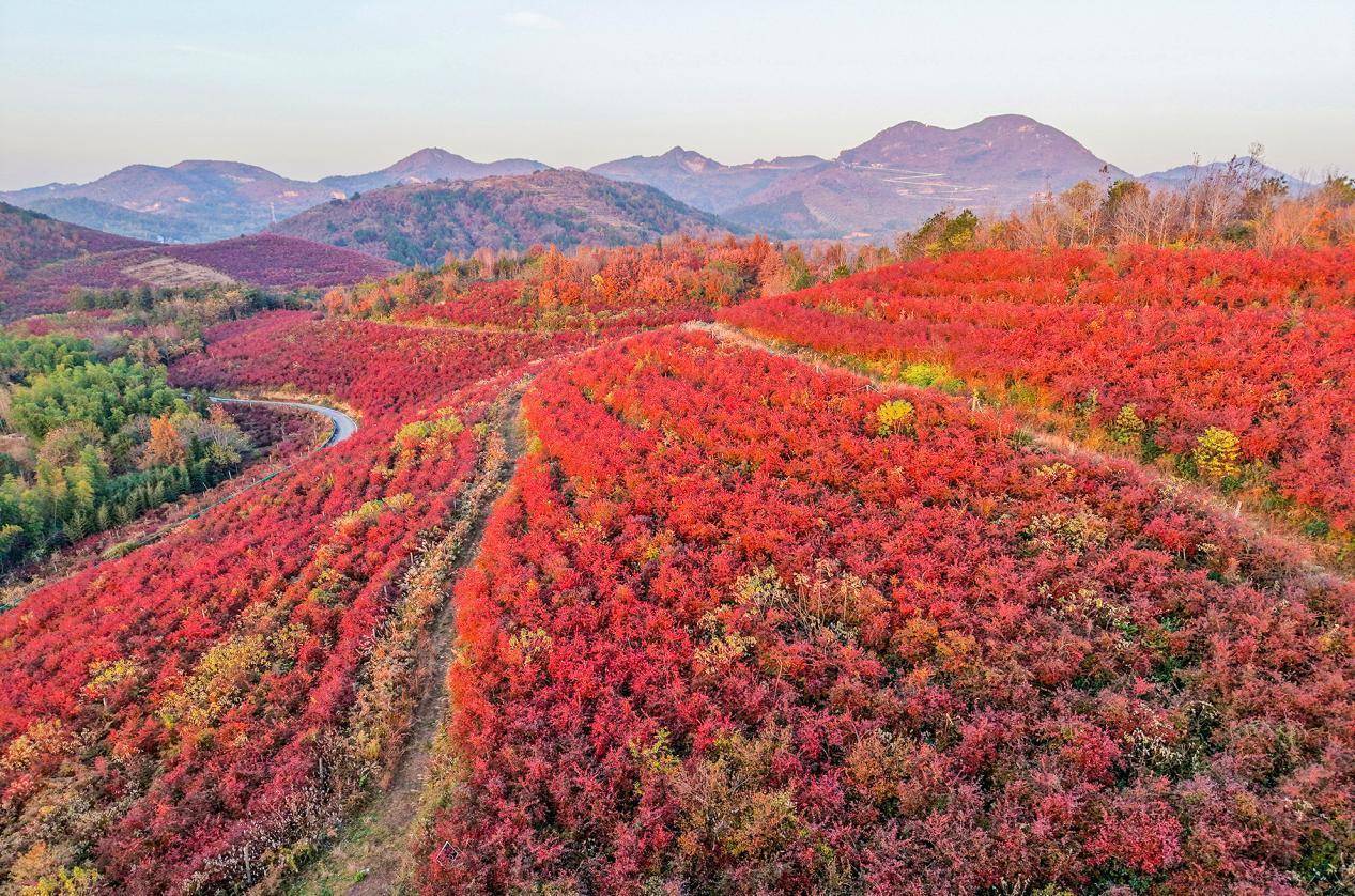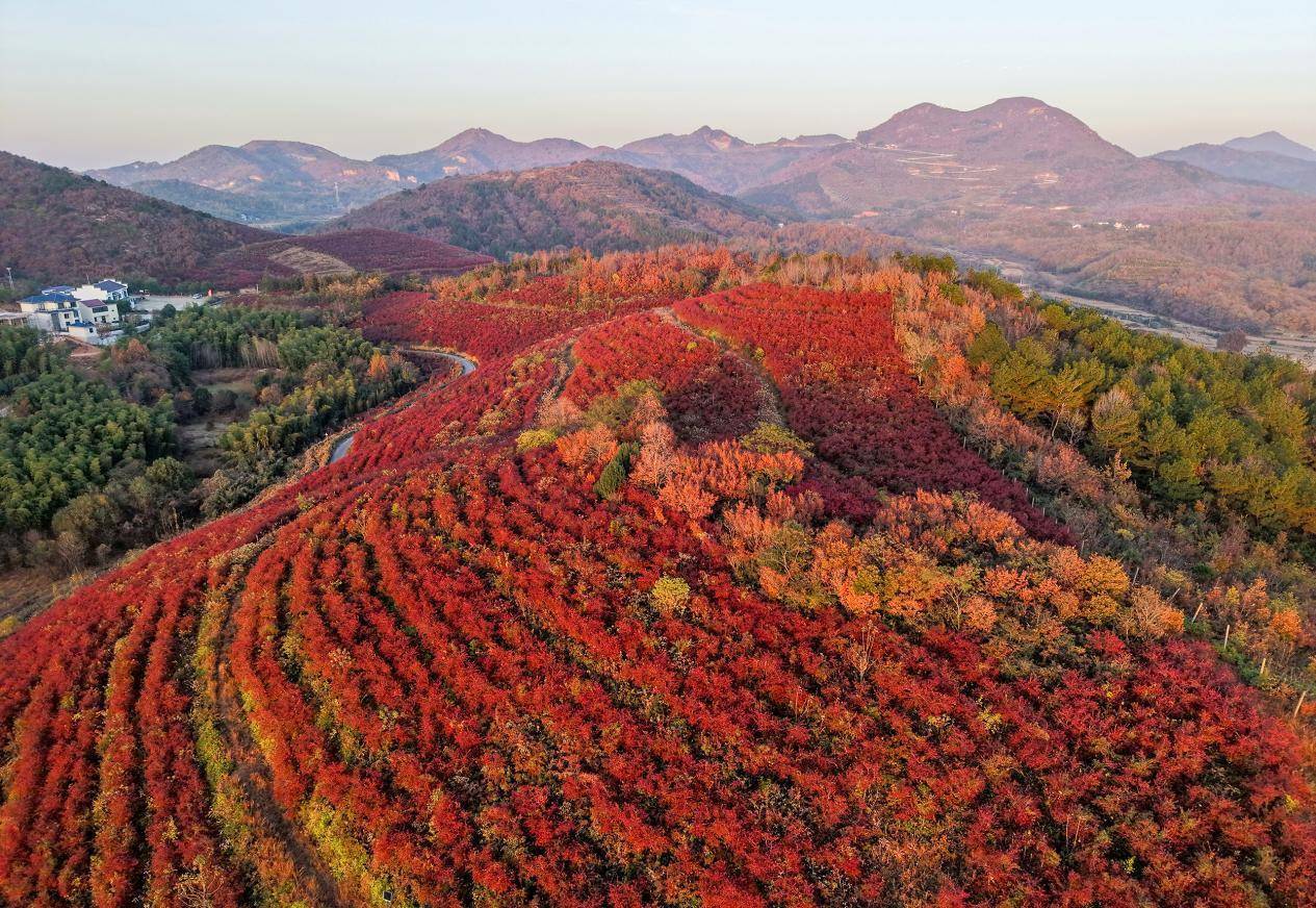 2025年11月26日,安徽省合肥市庐江县矾山镇乐华村山坡上,近千亩蓝莓进入休眠期叶子由绿变红,艳丽的色彩染红了绵延的山峦,一幅色彩斑斓的乡村生态画卷跃然眼前。